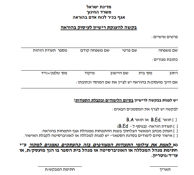 -אישור זכאות לתואר ותעודת הוראה (בחתימתם של נשיא\ראש המכללה ויו"ר המועצה האקדמית) .
